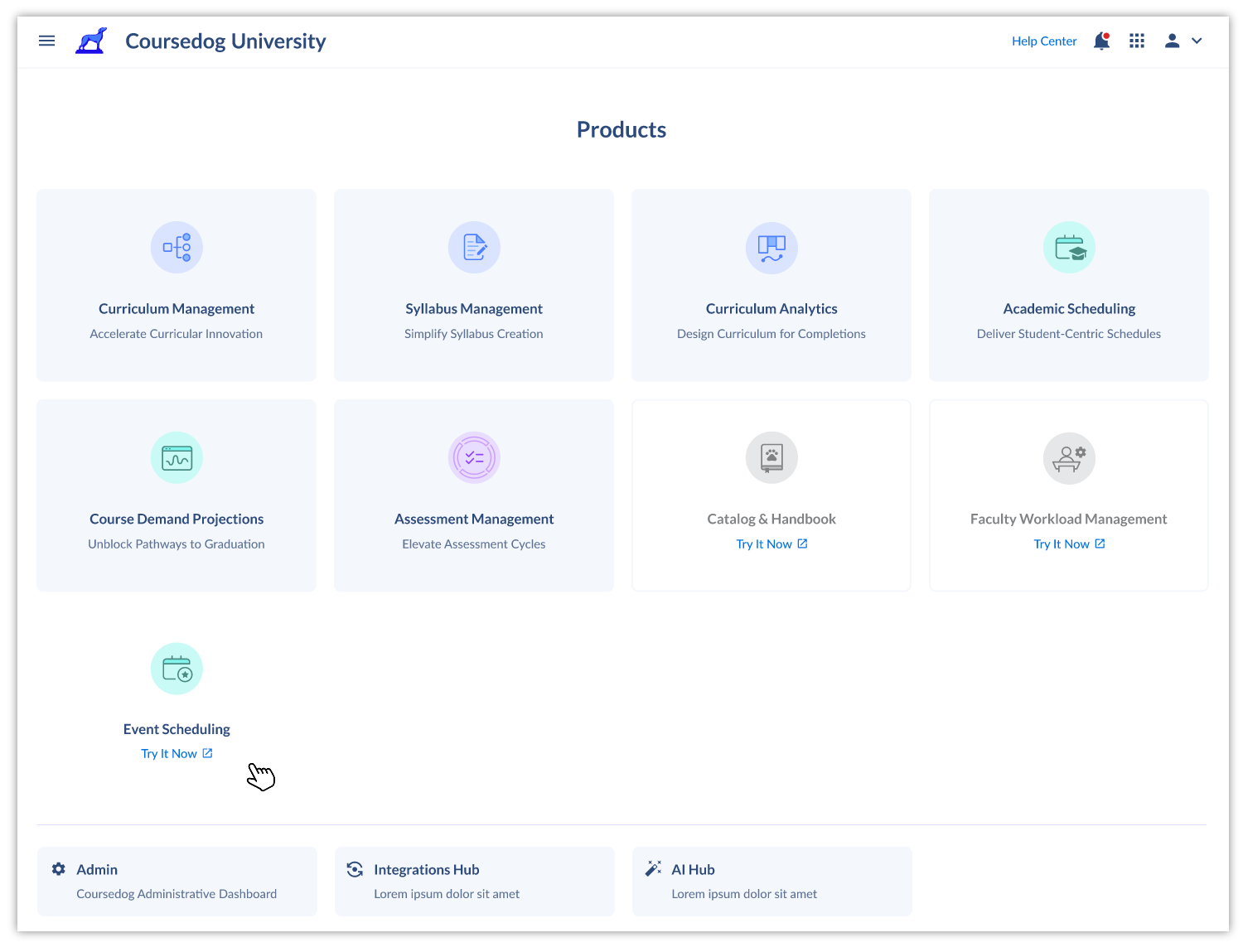 When you log into Coursedog, you’ll see a series of product tiles on your Products Home Page and Product Grid View.