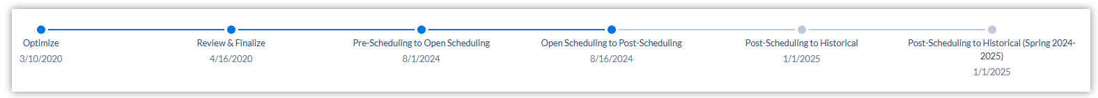 Your timeline will appear across the top of your Academic Scheduling homepage as a way of tracking your institution’s scheduling process.