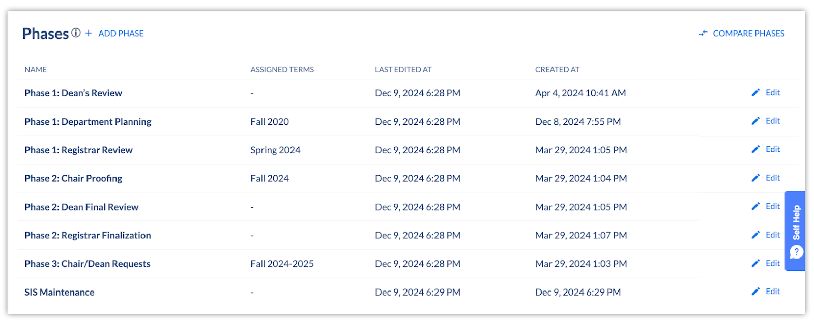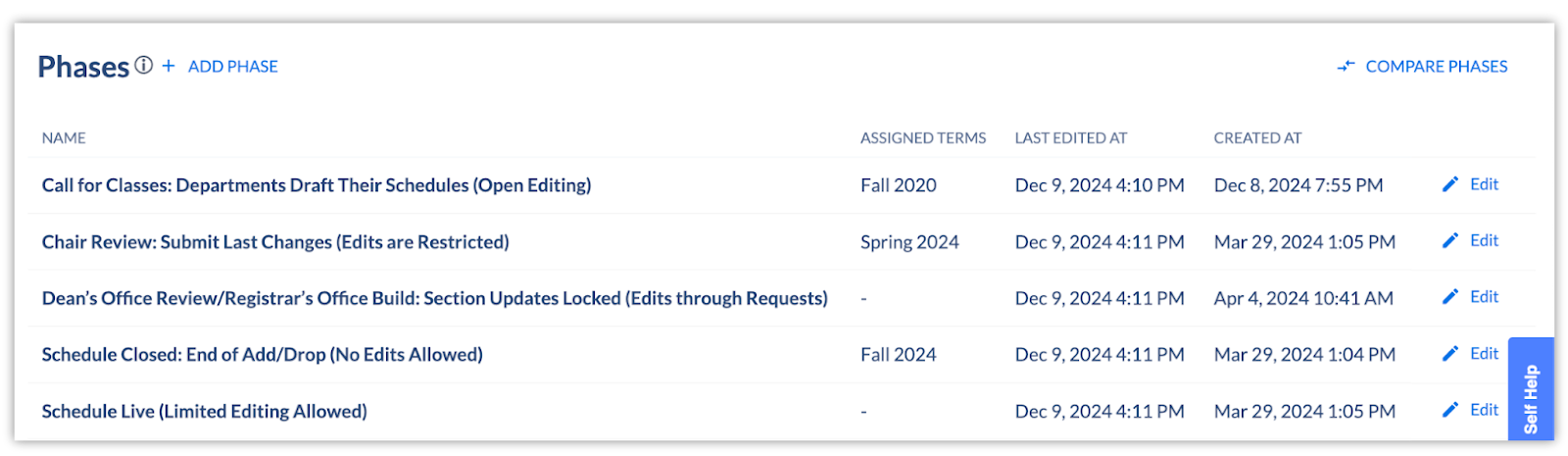Coursedog University has 5 scheduling phases; they’ve included a number in each Phase Name to ensure it’s clear which Phase comes first, second, and so on: