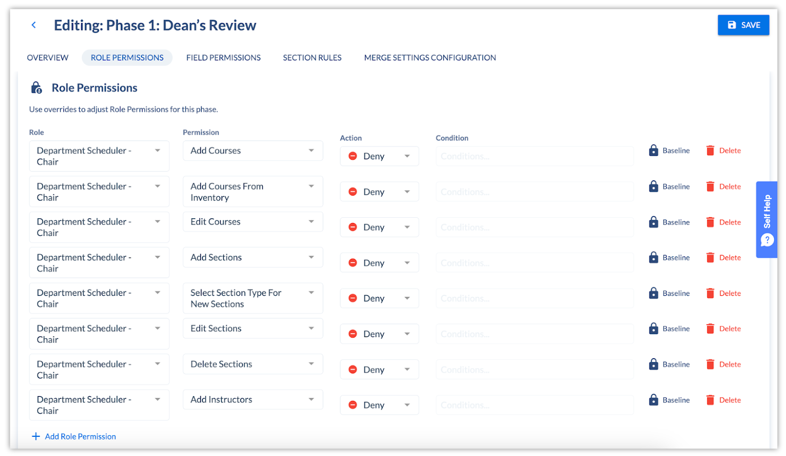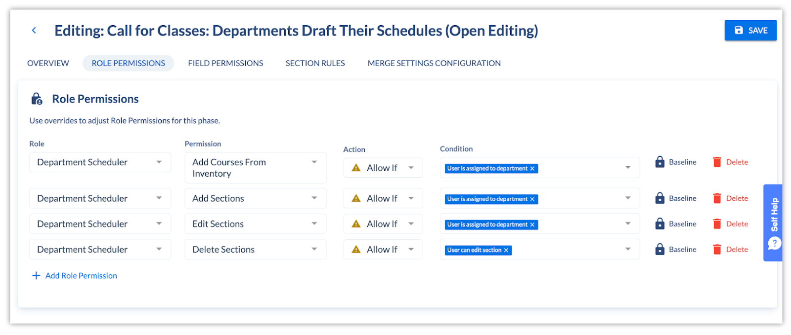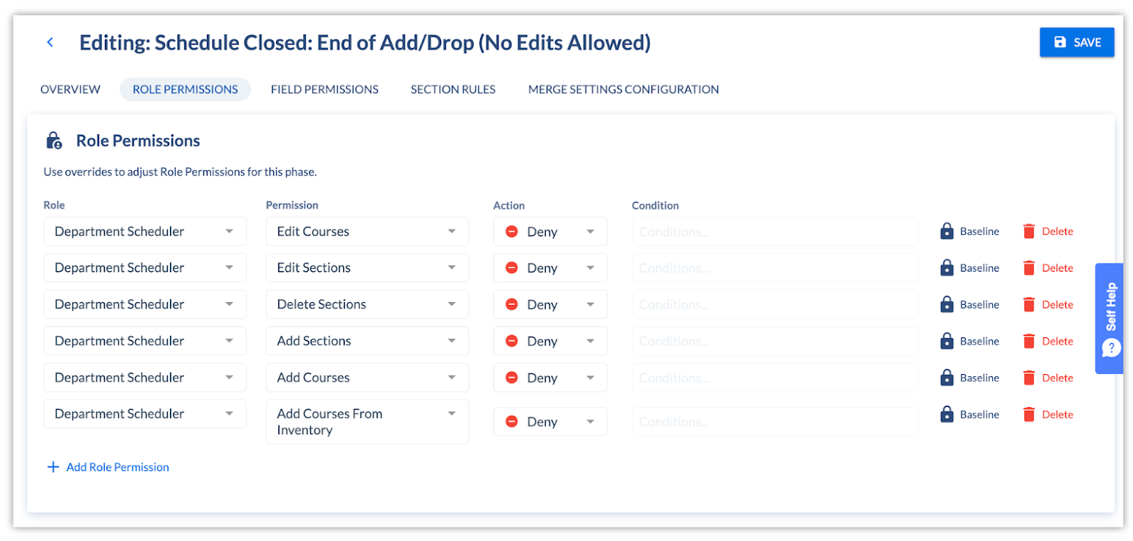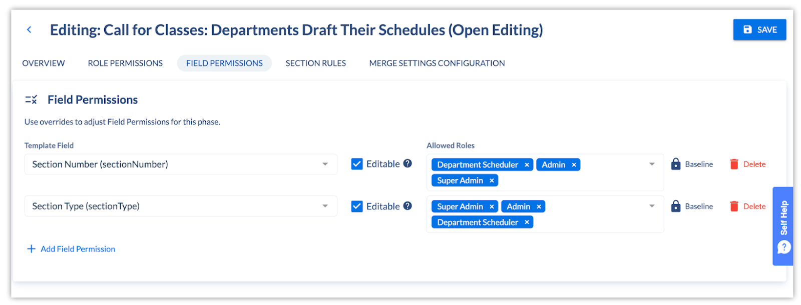 A “phase” is a combination of role and field permissions that can be associated with terms as your scheduling cycle changes. In other words, when your scheduling cycle is first beginning, you might want more users to have more editing abilities, but as the cycle progresses, you want to increasingly limit who can make changes (and to what).