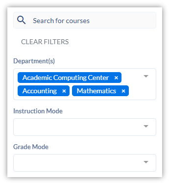 If a Catalog website visitor selects multiple departments when searching for courses, it will return courses that belong to all selected departments.
