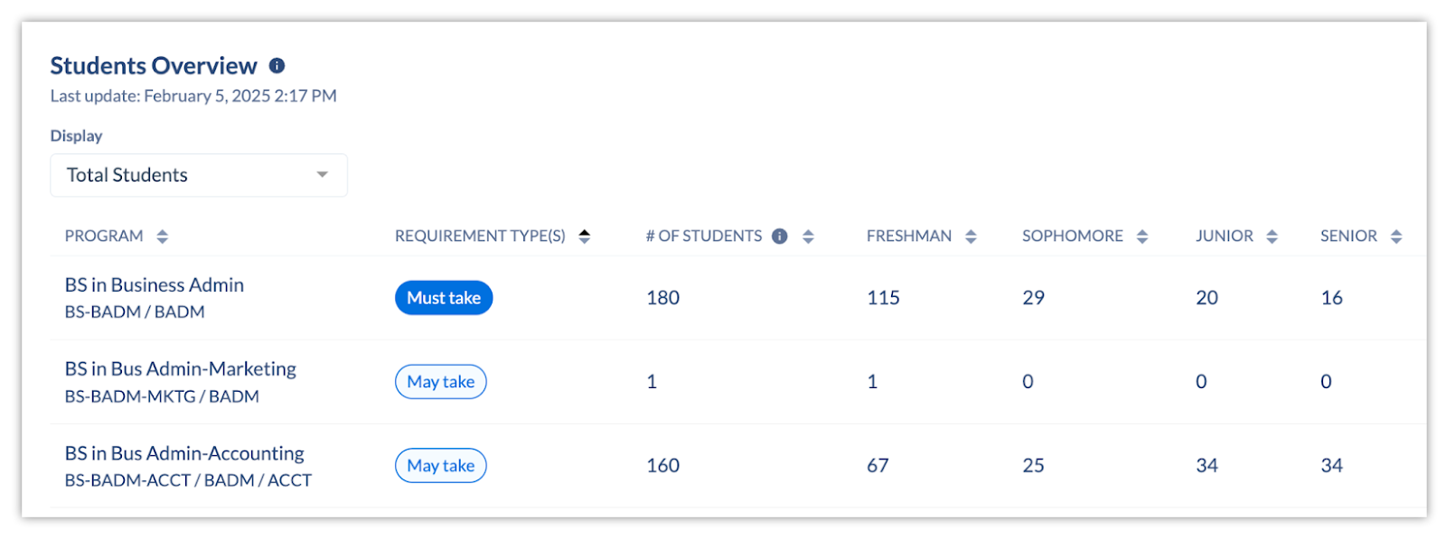 The “Students Overview” report flags how many current students may still take this course to meet a given requirement. It: