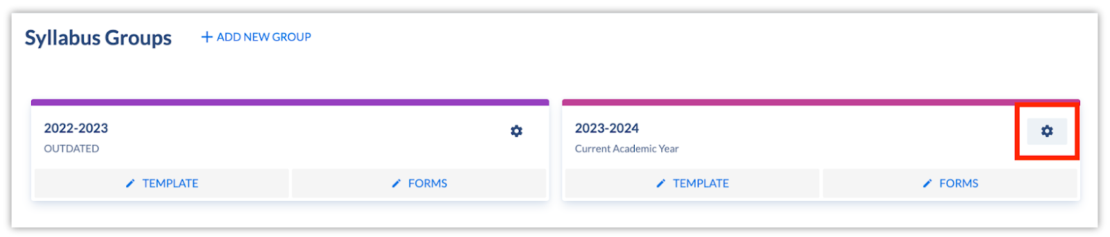 Step 1: To edit or delete a Syllabus Group, open the Syllabus Groups tab and click the Settings option on the Syllabus Group.