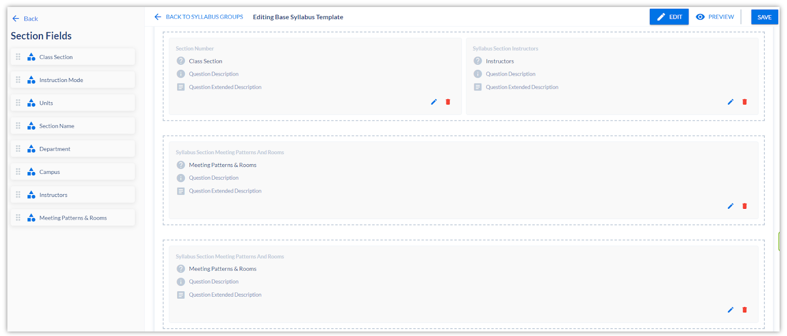 These Section Fields can be built into the syllabus, made required, and locked into the Template or Form. They will automatically populate with data as an instructor builds their syllabus, ensuring that all section data is up-to-date and accurate. Learn more about our Section Template.