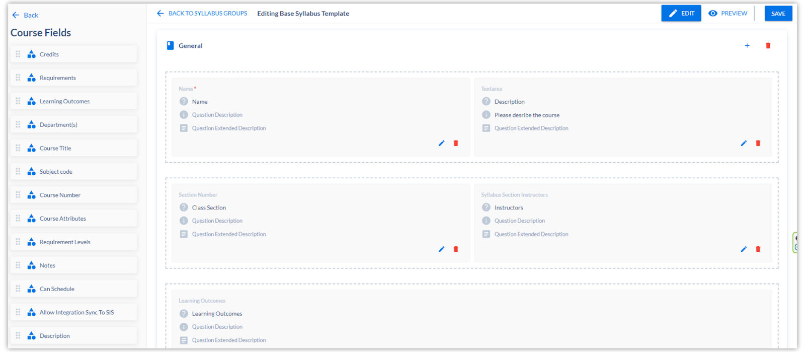 Any field on the Curriculum Course Template can be pulled directly into a Syllabus Form or Template, allowing Curriculum data to flow directly into the Syllabus. This includes fields like Description, Learning Outcomes, and Instruction Mode. Learn more about our Course Template.