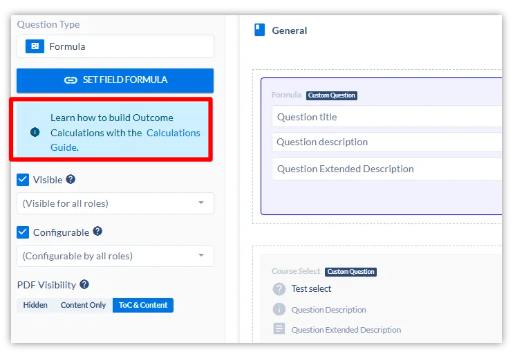 If you need information about the types of configurations available, they are referenced at the bottom of this article and can be accessed via the “Calculations Guide” included within the field’s Question Settings.