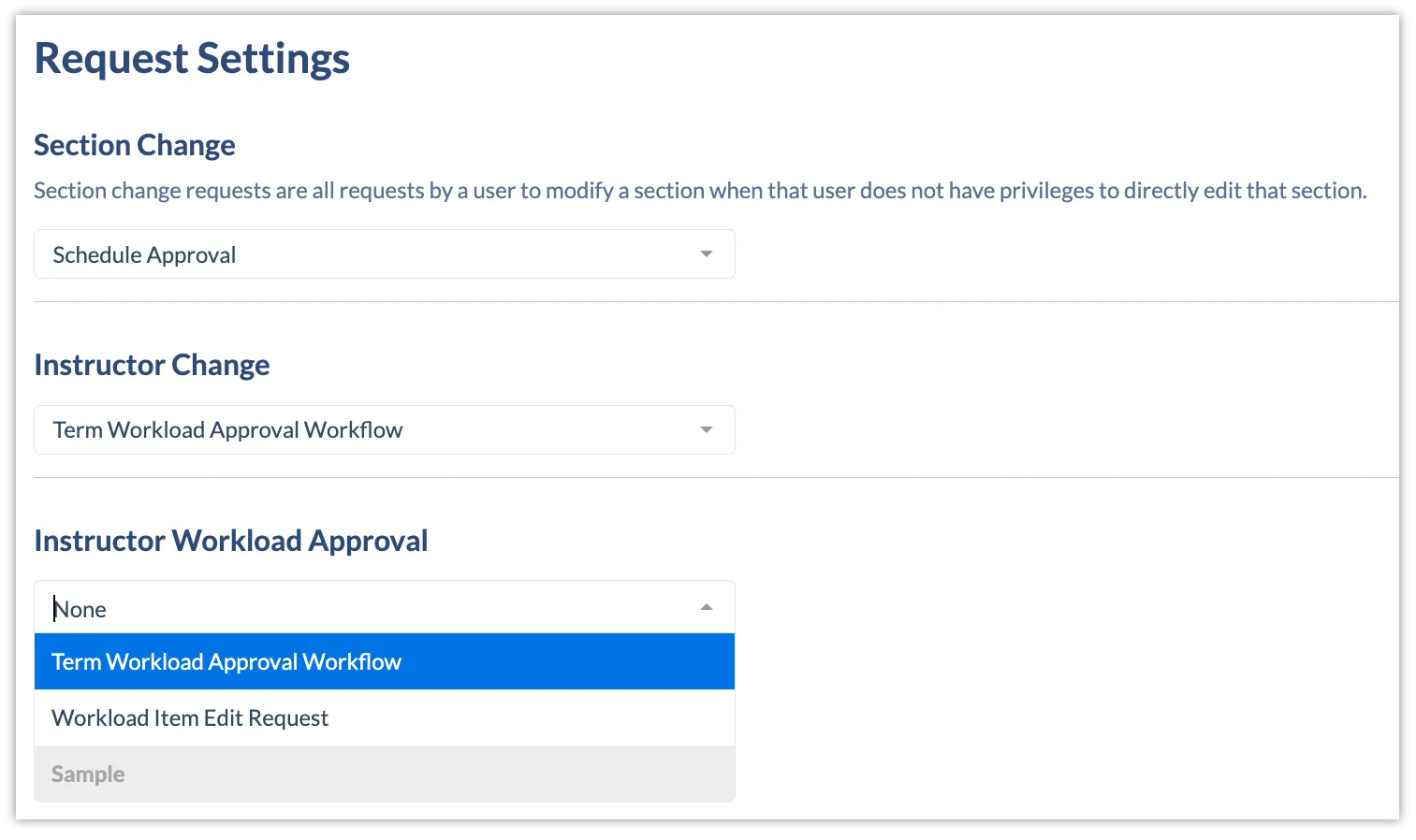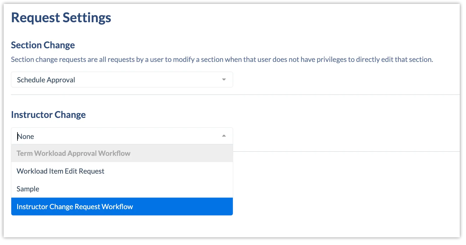 Once you have created your Workflow, navigate to Settings > Requests and select this Workflow from the “Instructor Change” dropdown menu – this action associates this Workflow with the Request type so that any Requests to Edit Workload go through this Workflow.